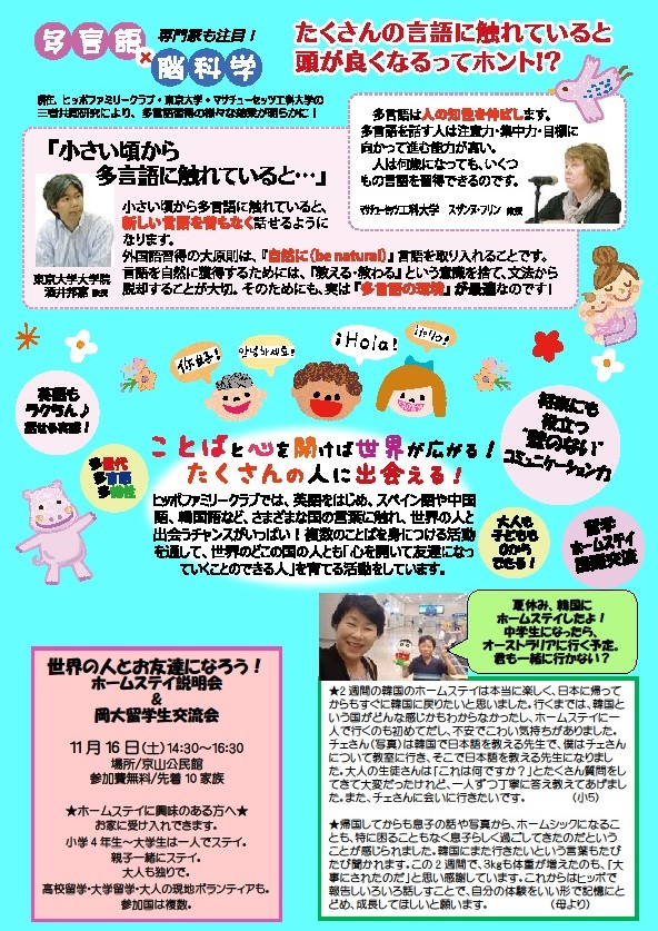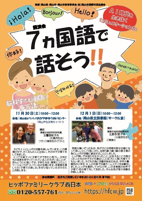 《講演会 7ヵ国語で話そう!!》日時:12月1日(土)10:00~12:00会場:岡山県立図書館託児:あり 要予約お一人300円AI時代を生き抜く「コミュニケーション力」が、多言語で身につく。多言語の世界でたくさんの人に出会い、「ことば」も「人間」も育つ。脳科学でも注目の「多言語」多言語の世界を体験談を交えながら、お話しいたします。お申込みはフリーダイヤル0120-557-761または、お申し込み専用フォームhttp://www.hfcw.jp.mail/へどうぞ。